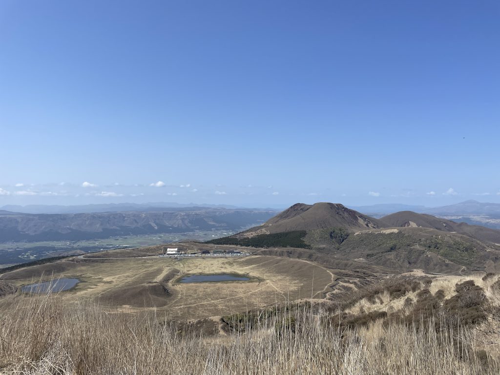 『上から見る草千里ヶ浜、太陽の塔の顔みたい。』
