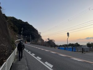 歩き出しはまだ暗かったけれど徐々に明るくなり、海沿いまで来たら海が朝焼けに照らされてきました。