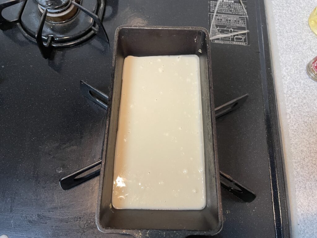 ②フライパンを弱火で温める。温まったら薄っすら油を引いて①の生地を流し込む。