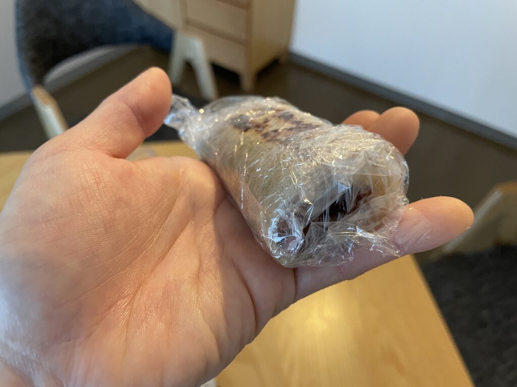 餡子ロールは小麦粉で包んでいるのでラップがべたつかないし、手でつかんで食べることもできます。