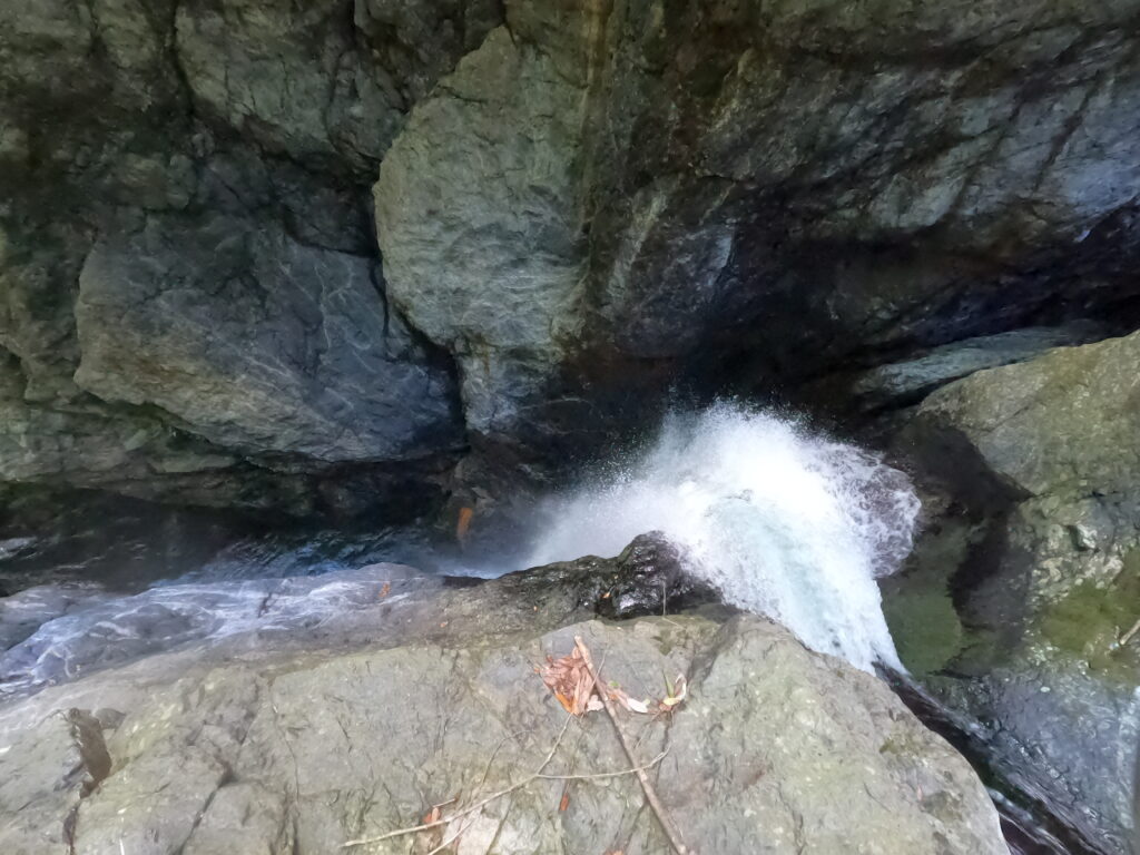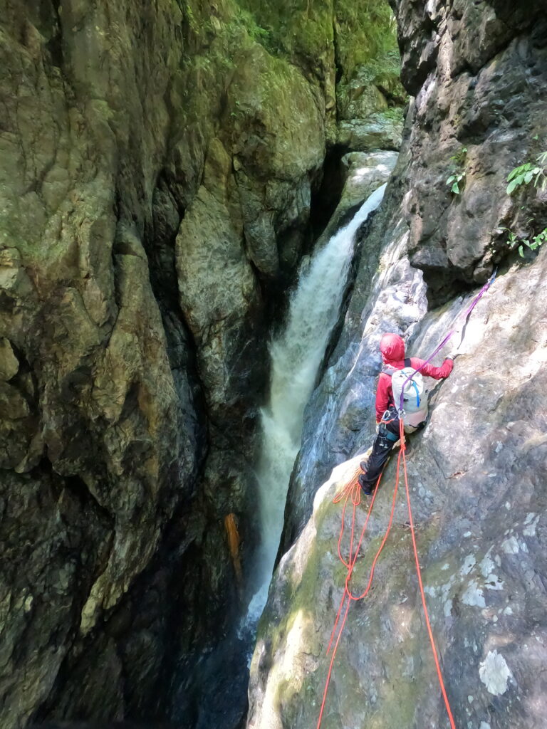 徐々に小滝ゾーンに入り、3mの滝が出てきます。こちらは2人で代わる代わる泳いでトライしましたが取りつくこともできず、巻くことに。