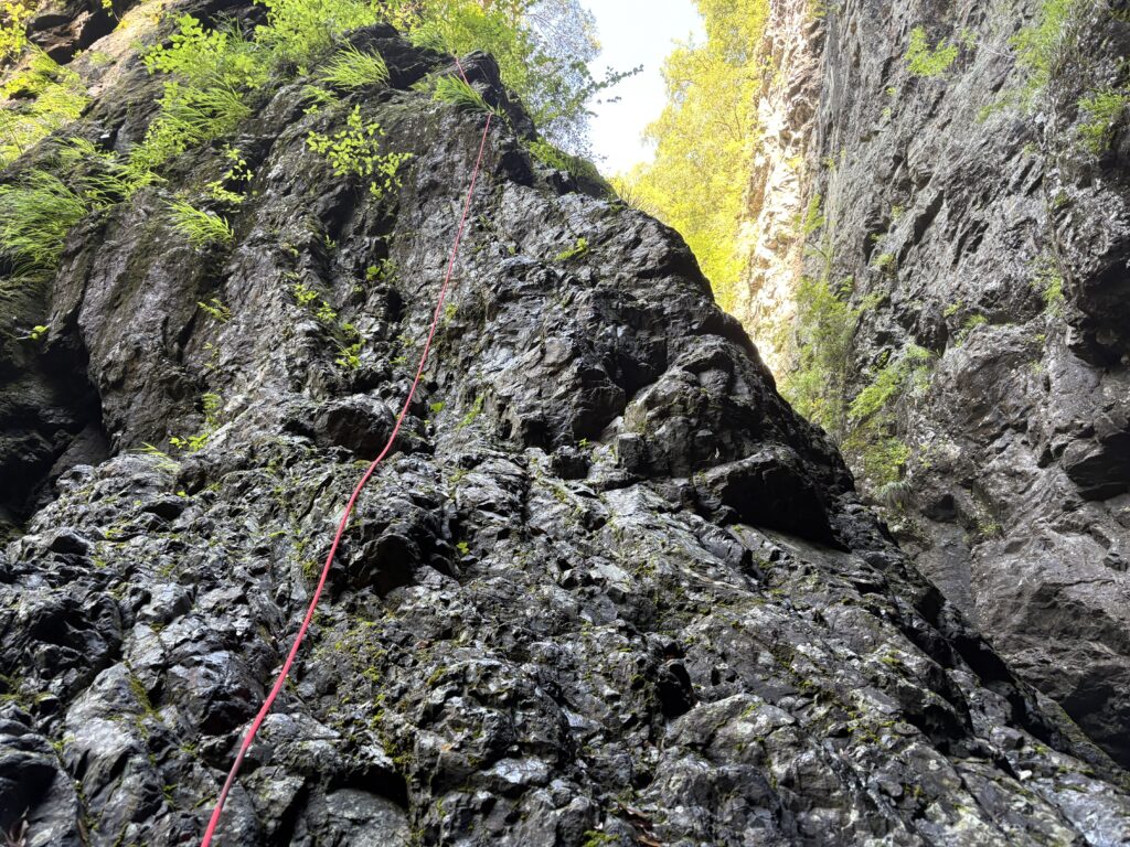 7m滝は登れないので右岸の岩からロープを出して巻きました。
