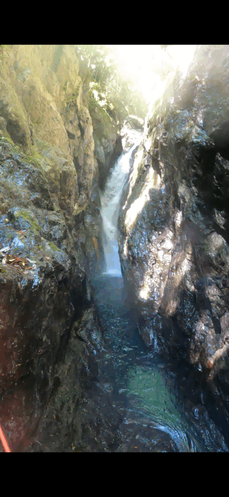 上を見れば青空なのに、ゴルジュ内は谷が深すぎて暗く、水も濁っていて足がすくむような雰囲気。