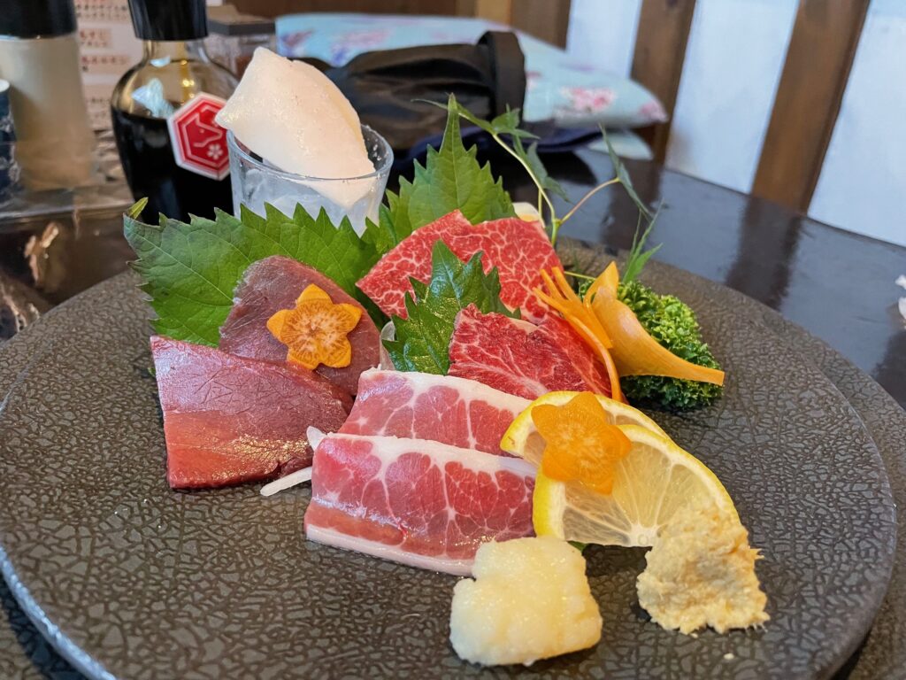 Kumamoto is famous for basashi- thinly sliced raw horse meat.
