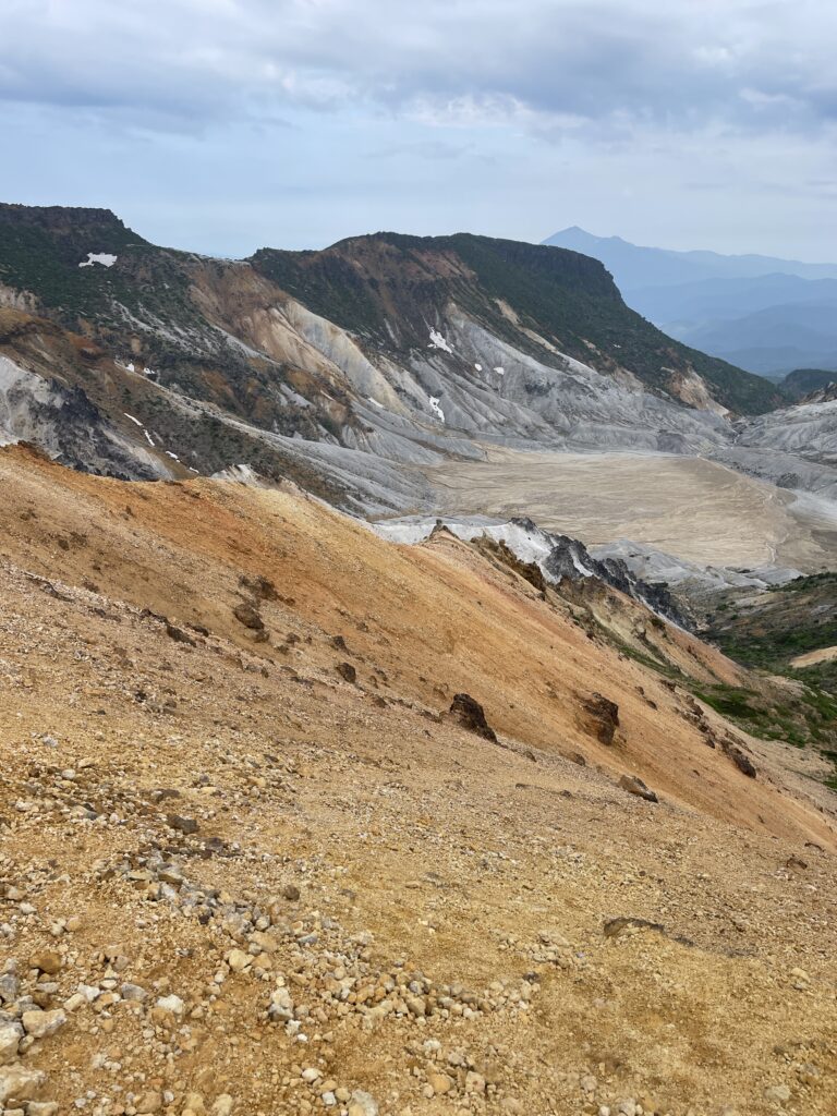 鉄山避難小屋からだと火口までは見えないけれど、稜線からはより間近にダイナミックな沼ノ平を拝むことができます。
